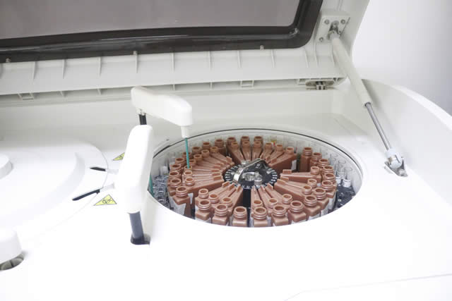 Este equipamento realiza exames bioquímicos, isto é, que investigam o funcionamento dos processos metabólicos do organismo. São eles: glicose, colesterol, triglicerídeos, exames de função hepática, função renal, função cardíaca, eletrólitos, entre outros.